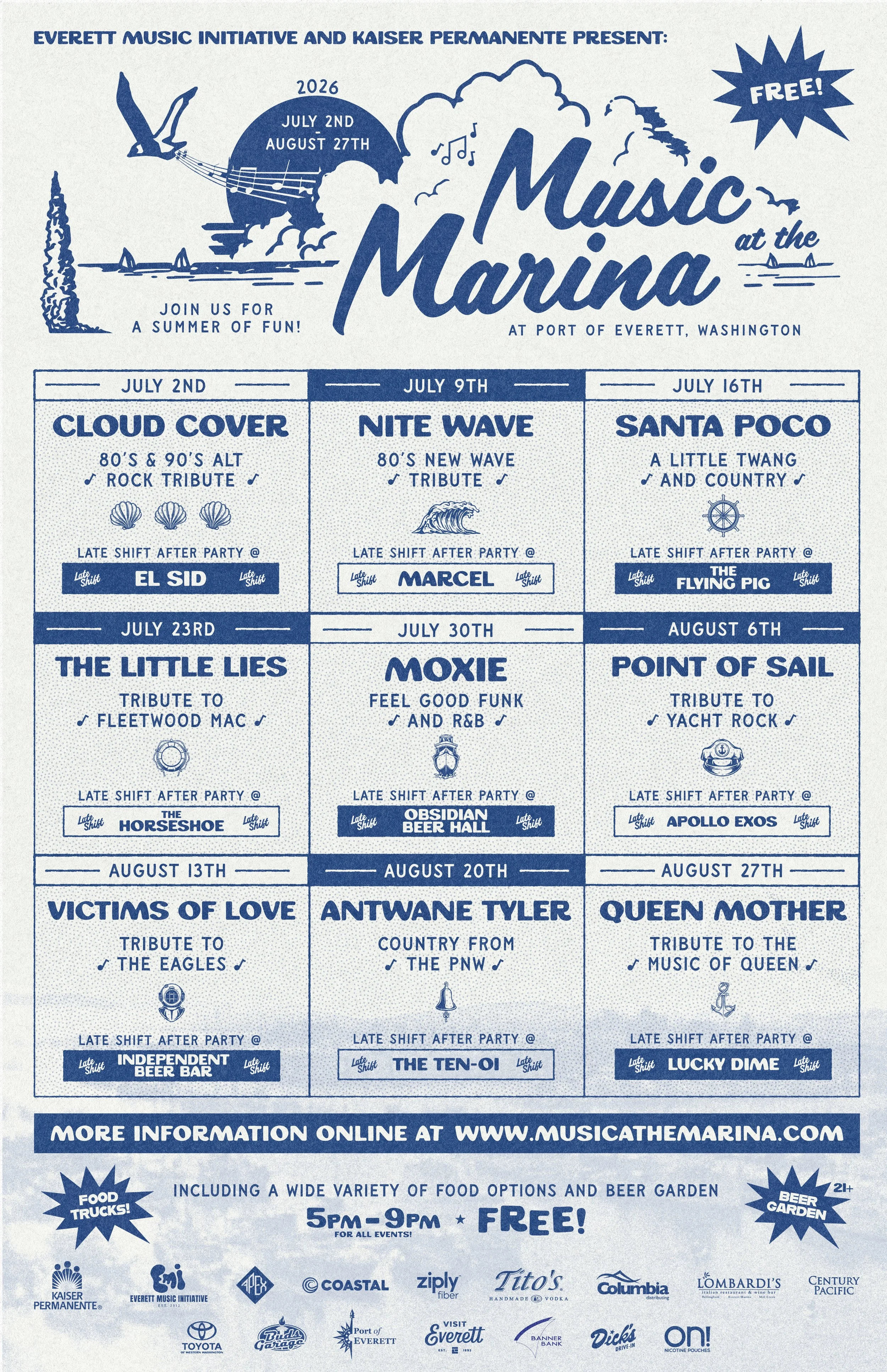 Music at the Marina has become one of Everett’s most beloved summer traditions, bringing thousands to the waterfront each year for free live music. While the City of Everett and the Port of Everett provide important support, more than 80% of the series is made possible through community sponsorships and donations.